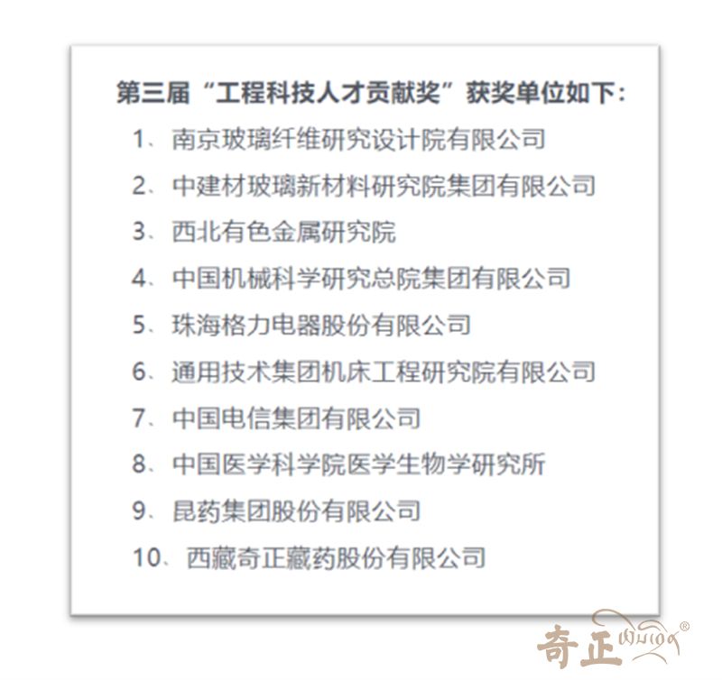 近日,第三屆中華國際科學交流基金會“工程科技人才貢獻獎”獲獎名單揭曉,奇正藏藥榮譽上榜。