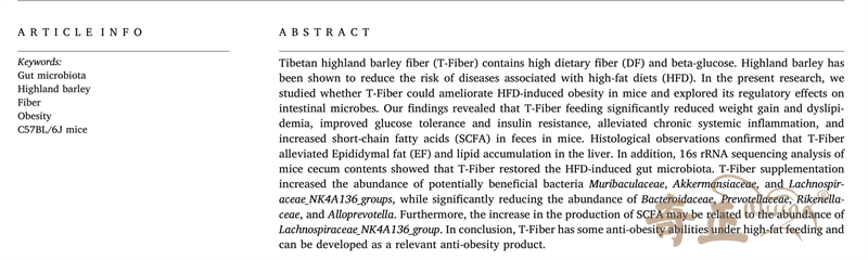 青稞高纖粉(T-fiber)含有較高的膳食纖維(DF)和β-葡萄糖。青稞已被證明可以降低與高脂肪飲食(HFD)相關(guān)的疾病風(fēng)險。這篇論文主要研究了西藏青稞高纖粉(T-fiber)是否能改善HFD誘導(dǎo)的小鼠肥胖,并探討了其對腸道微生物的影響。結(jié)果表明,青稞高纖粉(T-fiber)喂養(yǎng)能夠顯著減少小鼠體重增加、改善葡萄糖耐量和胰島素抵抗、緩解慢性全身炎癥,同時小鼠糞便中短鏈脂肪酸(SCFA)也有增加??傊?,青稞高纖粉(T-fiber)具有一定的抗肥胖能力,可以作為相關(guān)的抗肥胖產(chǎn)品來進行開發(fā)。
