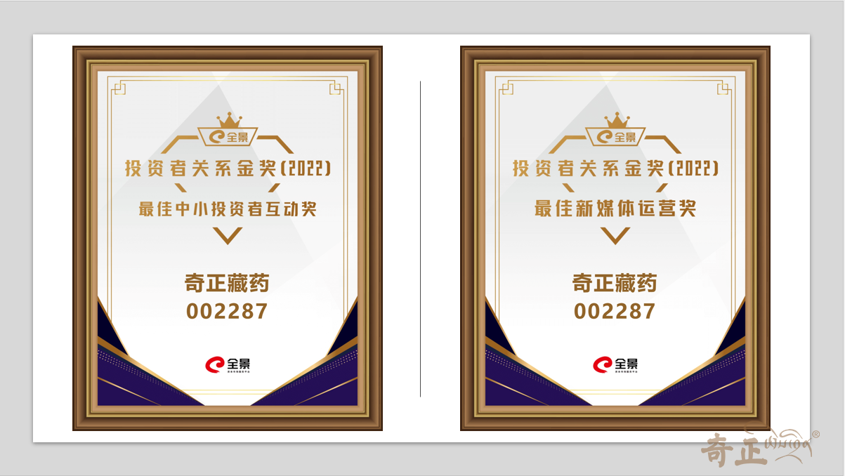 5月23日,“全景投資者關(guān)系金獎”2022年度全國性評選的獲獎榜單正式揭曉,奇正藏藥喜提“最佳中小投資者互動獎”、“最佳新媒體運營獎”兩項殊榮。