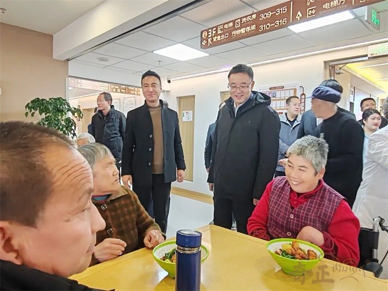 調(diào)研過程正趕上長者們的用餐時間,領(lǐng)導(dǎo)們步入用餐區(qū),溫馨愉悅的氛圍撲面而來,老人們圍坐餐桌旁,飯菜熱氣騰騰,營養(yǎng)搭配豐富。各級領(lǐng)導(dǎo)與老人們紛紛交流,關(guān)切詢問飯菜是否可口以及日常生活情況,茍廳長認(rèn)真查看了奇正康養(yǎng)在照護方面采取的詳細舉措,了解護理人員對于長者的“九防”和“五?!惫芾砝砟?,詳細詢問長者離院管理等方面的管理措施。同時,對于康養(yǎng)院照護工作中開展的培訓(xùn)、演練、長者照護等日常工作給予了高度肯定。